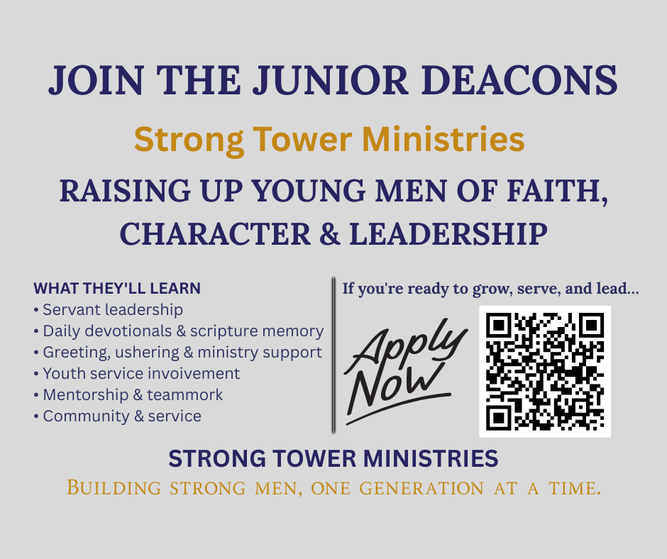 The Junior Deacon Ministry exists to train young men in servant leadership, spiritual discipline, and practical ministry support. This application helps us learn more about your commitment, character, and readiness to serve.