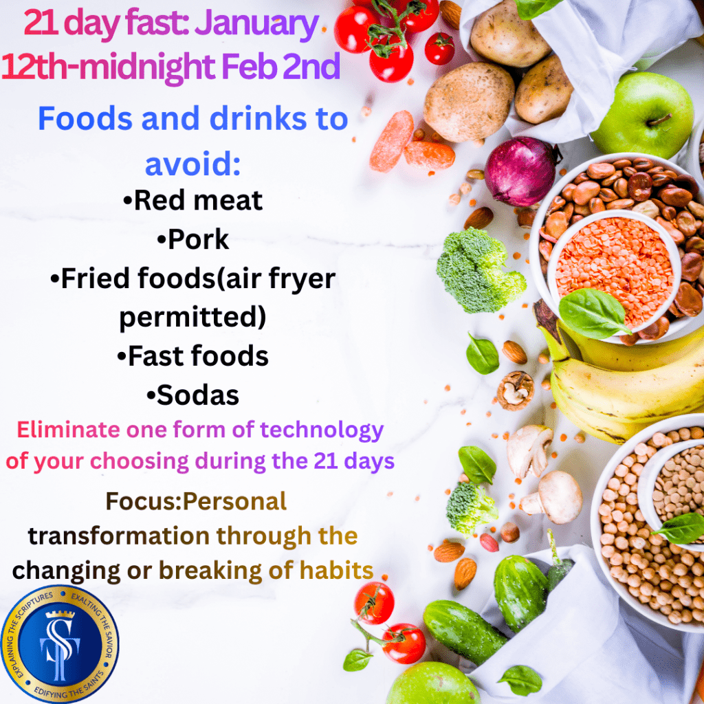 Now to the specifics about our fast in January. As previously stated, the fast will begin January 6th and will conclude at midnight of February 1st. The fast will be for the entire day. We will eliminate the following food and drinks for the fast: red meat, pork, fried foods (air fryer use is permitted), fast food, and sodas. Please consult your physician to ensure proper health and food requirements prior to the fast. We will also eliminate one form of technology from 6 pm-6 am (aside from school and work). Examples of this may be social media, television, iPad, gaming, iPhone, etc. This will be of your choosing. I am asking that you devote 10 minutes of uninterrupted prayer per day for 26 days. I have prepared Bible chapters for us to read each day. The Word will strengthen us spiritually as we walk with the Lord.